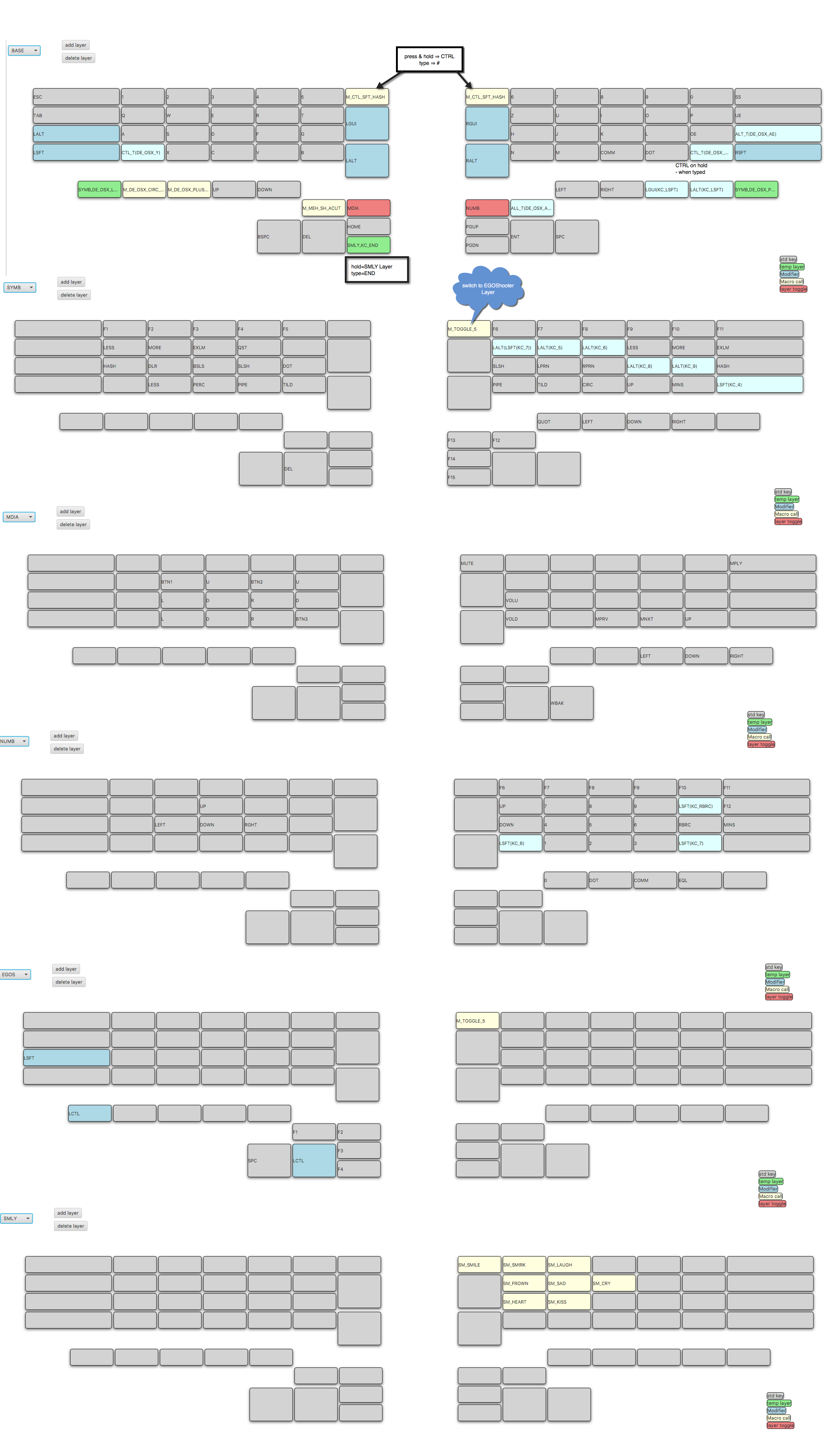- several keycodes (like CTRL) are defined on multiple locations due to several reasons: sometimes I like to type for example CTRL on the right, sometimes on the left half of the keyboard, depending on the context. and I did not always know what to put at a certain key - too many keys there :) As already mentioned, this is a layout that works for me quite ok now. I will probably improve it over time (fortunately that is possible). It is opensource and available in github. Maybe you have additional ideas, how to improve things. Or you create your own custom firmware. But this is just the beginning...